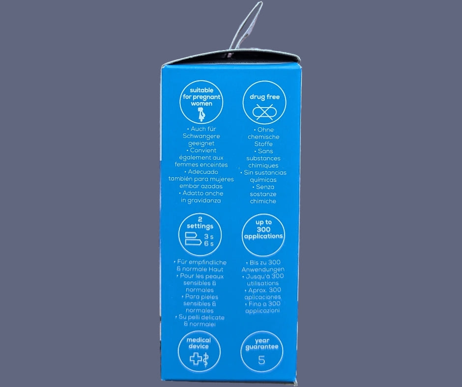 - 2 verschiedene Programme: 1. Programm für die Erstanwendung und bei empfindlicher Haut und 2. Programm für die regelmäßigen Anwendungen